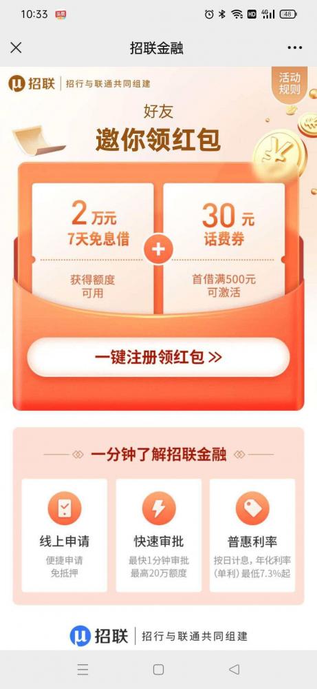 点击一键注册领取,测试额度,点击一件注册领取,学历本科以上,工资8000或以上都可,其他信息随便填写。不用下载招联金融软件,出额后会给你发短信,短信显示可用额度大于0截图即可。